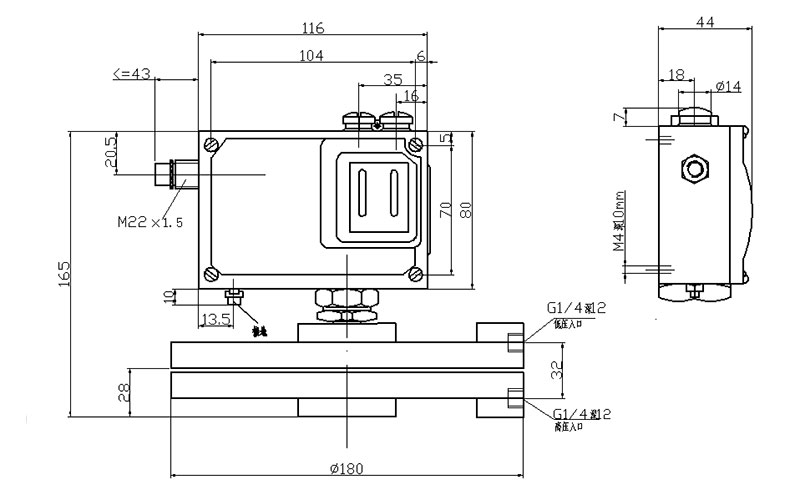 520M/7DD防爆差壓開(kāi)關(guān)外形尺寸及安裝尺寸(單位:mm)
