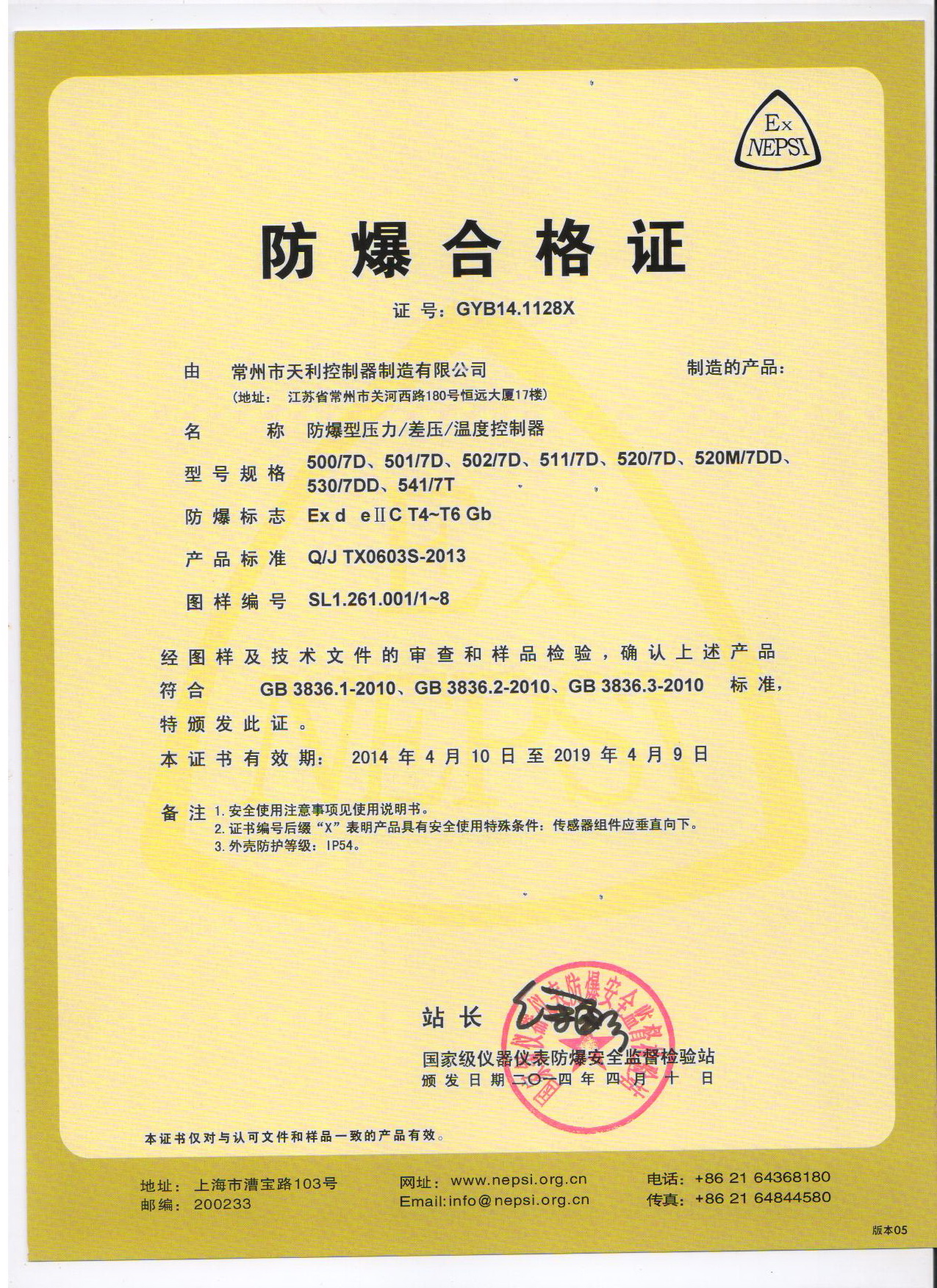 今天小編給大家介紹下本公司的防爆壓力開關(guān),本公司的防爆壓力開關(guān)有專業(yè)機(jī)構(gòu)的認(rèn)證,下面是證書,可以放心使用。