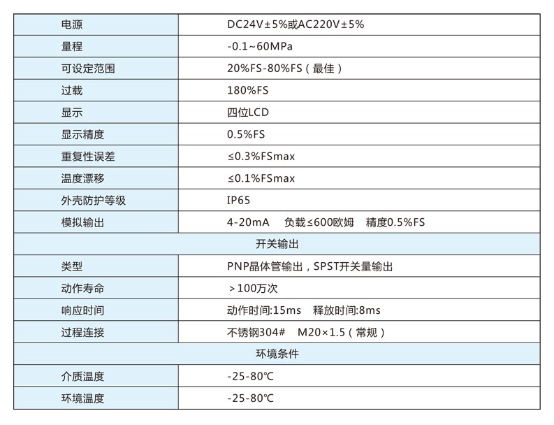 精度高,重復性好,壽命長,無膜片,無觸點,耐腐蝕性強,設定靈活方便,顯示直觀,溫漂小