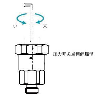 第二步:參照上圖螺絲刀調(diào)解壓力開關(guān)點大小,順時針方向調(diào)大,逆時針方向調(diào)小。